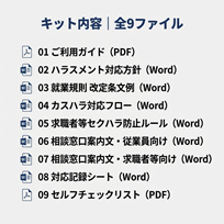 当事務所では、カスハラ対策・求職者等セクハラ対策に必要な書式を一式にまとめた「ハラスメント対策キット」を提供しています。